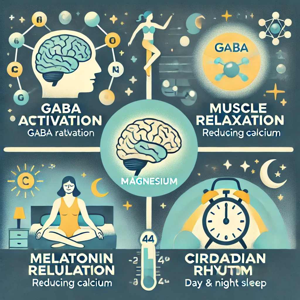 마그네슘은 우리 몸에서 300가지 이상의 생화학적 반응에 관여하는 필수 미네랄로, 특히 신경계와 근육 이완, 호르몬 조절에 중요한 역할을 합니다. 수면과 관련된 마그네슘의 주요 작용은 다음과 같습니다.